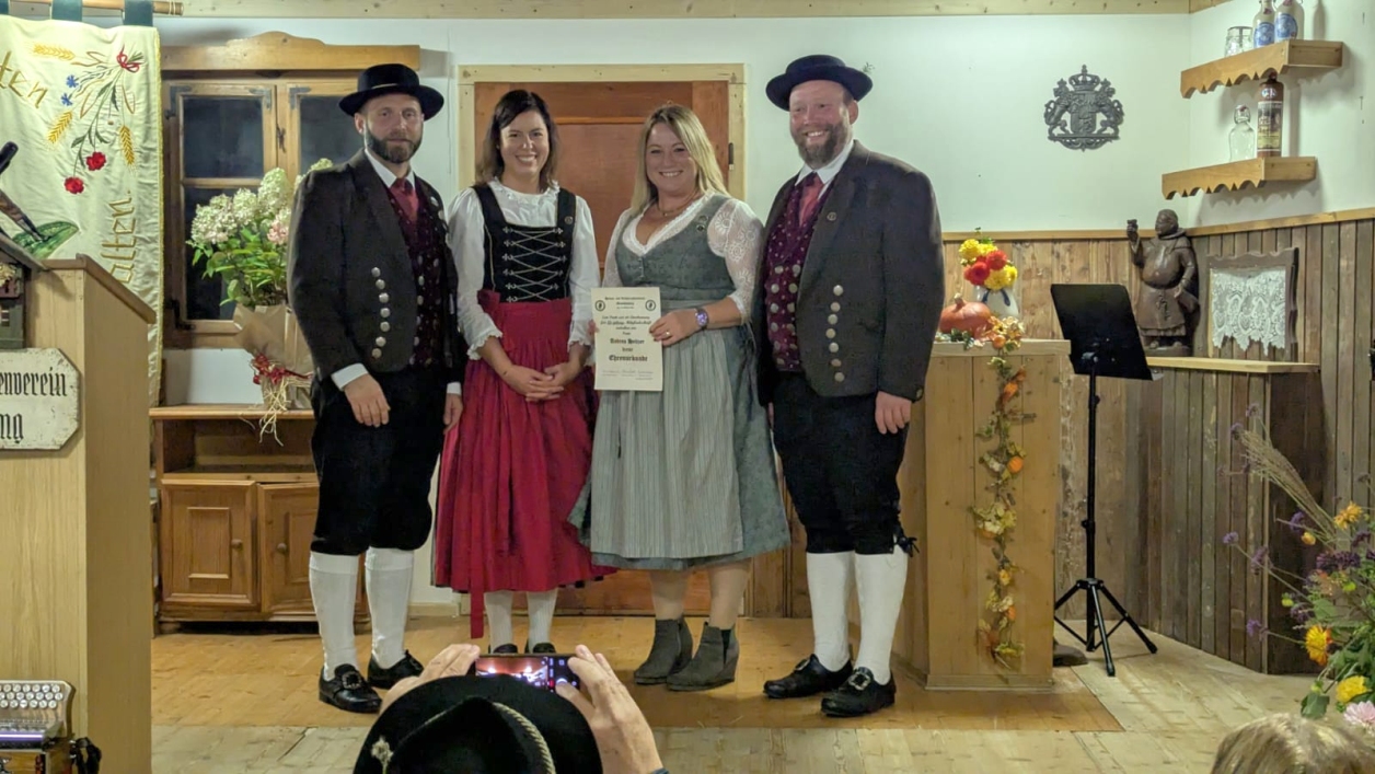 Geehrt wurden: Andrea Zankl und Andrea Gubisch für 25 Jahre Mitgliedschaft, Friedl Krumpholz für 40 Jahre, davon 29 Jahre als 2. Vorstand und für 60 Jahre Alfred Hoffmann, Hans Kollecker und die langjährige Schriftführerin und Mitvortänzerin Lieserl Willert.