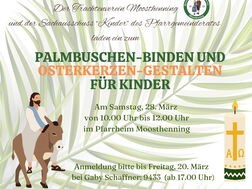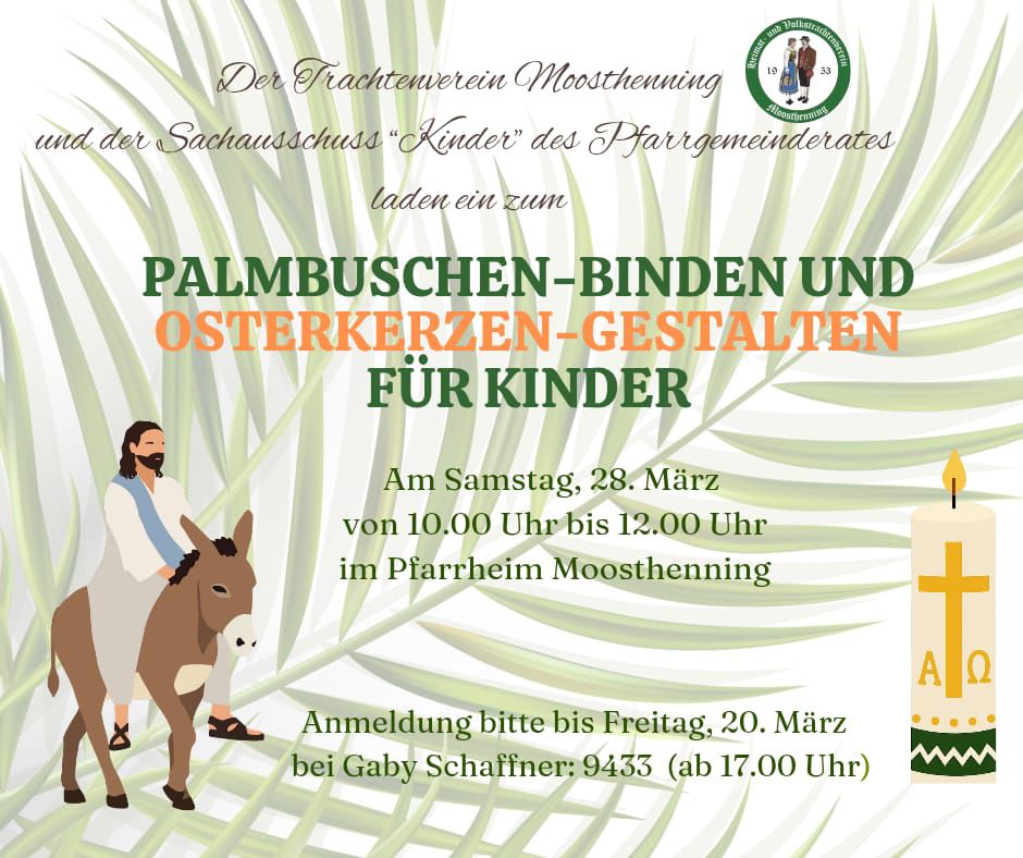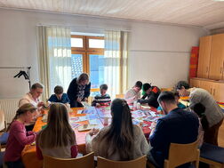 Die fleißigen Helferinnen hatten im Vorfeld schon die notwendigen Materialen hergerichtet und so konnten die Kinder pünktlich beginnen. Alle waren nach kurzer Zeit mit großem Eifer dabei, aus den Rohmaterialen einen schönen Palmbuschen bzw. eine kunstvoll gestaltete Osterkerze anzufertigen. Jedes Kind durfte selbstverständlich auch mehrere Exemplare für die eigene Familie, aber auch für den Verkauf am Palmsonntag vor dem Gottesdienst herstellen. So verging die Zeit wie im Flug und am Ende hatten alle ihre vorgenommenen Exemplare gebastelt. Auch unser Verein bewahrte mit dem Projekt den Osterbrauch des Palmbuschenbindens vor dem Vergessenwerden.